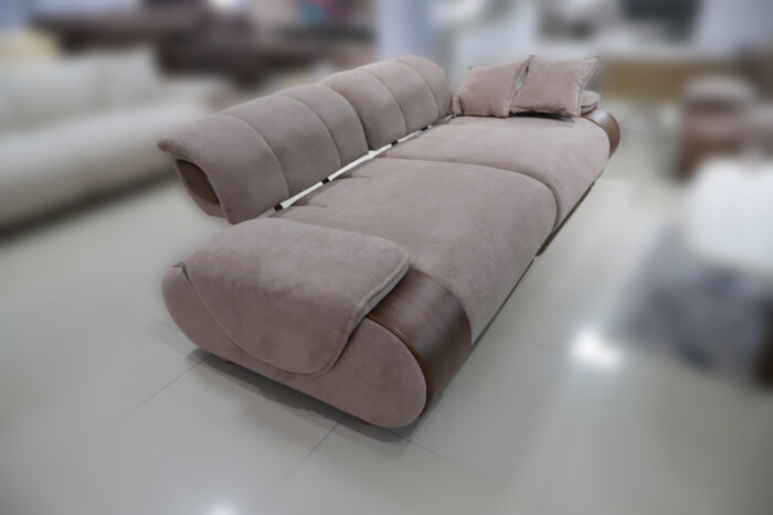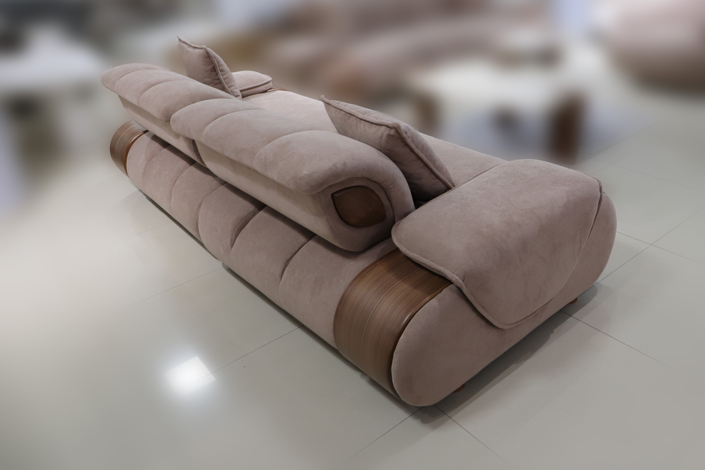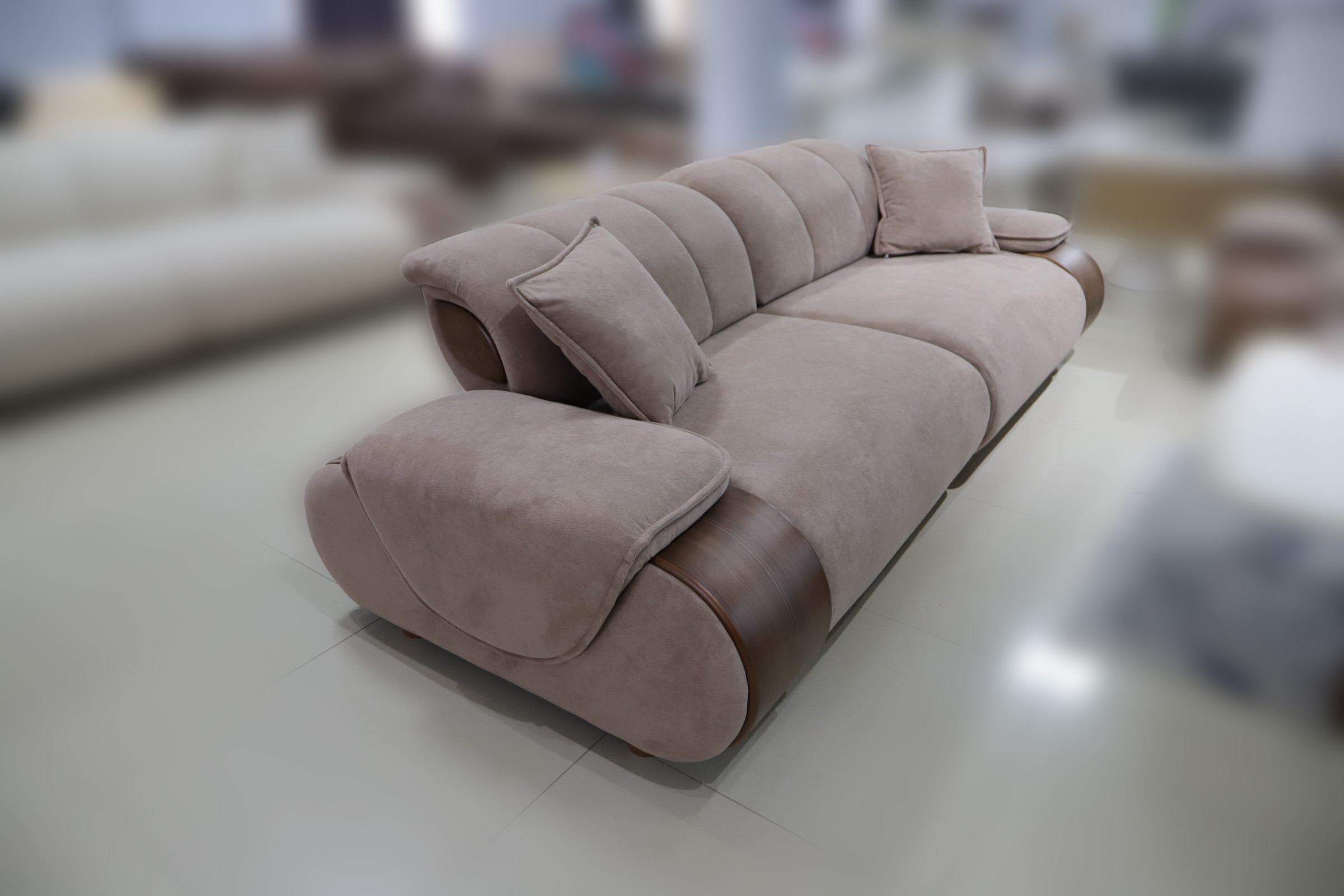Izrađena od novog bukle štofa, sa drvenim bočnim detaljima i drvenim nogarama, idealna je za moderan i elegantan dnevni boravak.