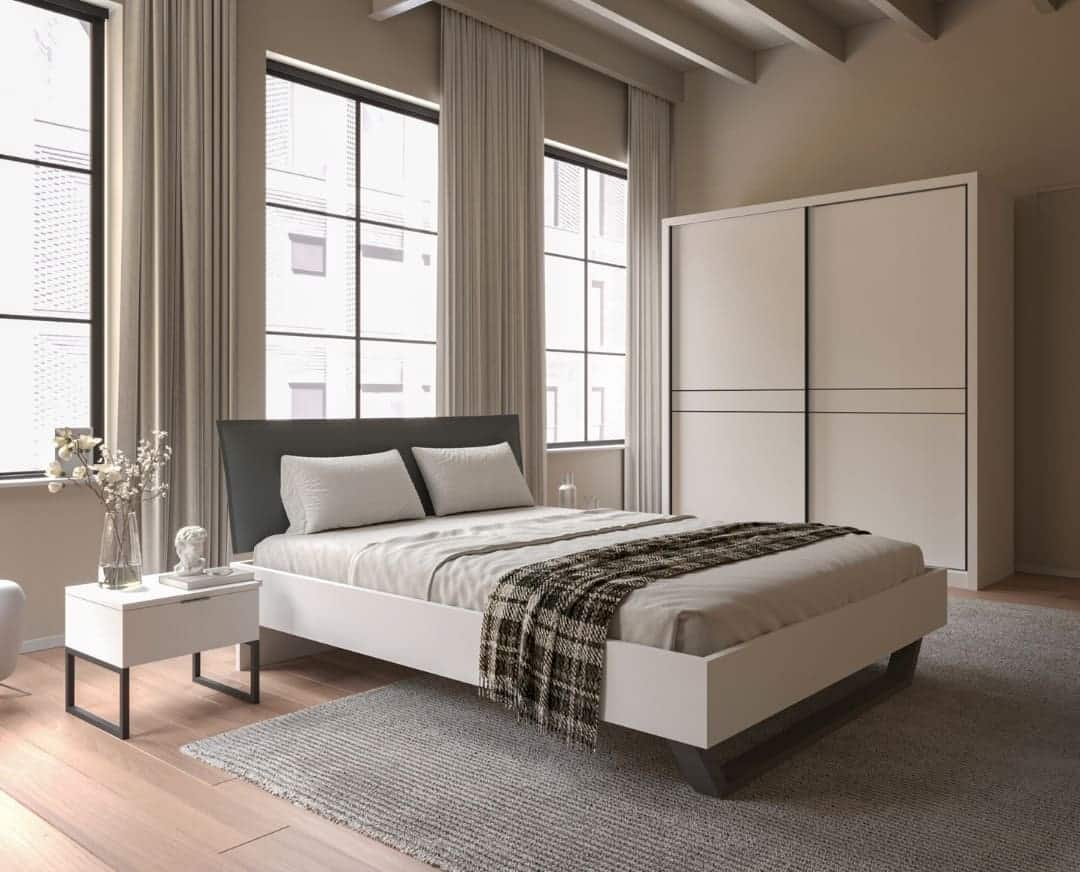 Krevet Dream je idealan izbor za savremene spavaće sobe koje kombinuju funkcionalnost i modernu estetiku. Njegov prepoznatljiv dizajn sa crnim metalnim nogarima u kontrastu sa toplim drvetom ili čistim belim dekorom čini ga centralnim komadom svake spavaće sobe. Naslon je dodatno naglašen tamnosivim tonom koji doprinosi elegantnom i sofisticiranom izgledu.