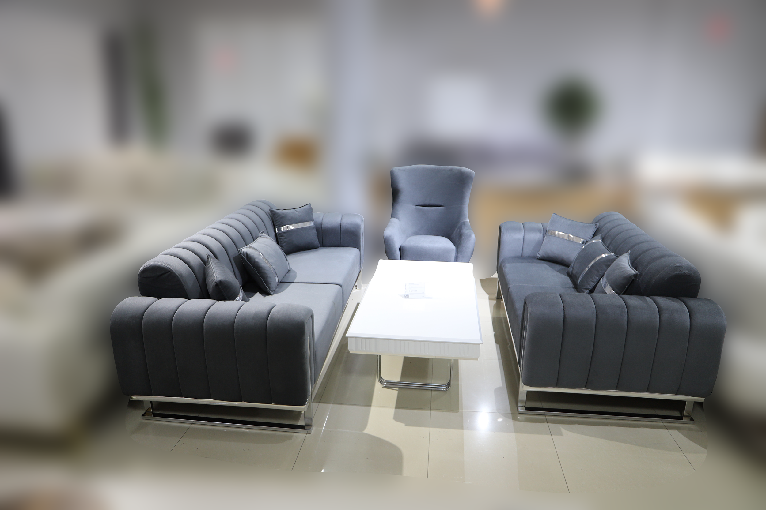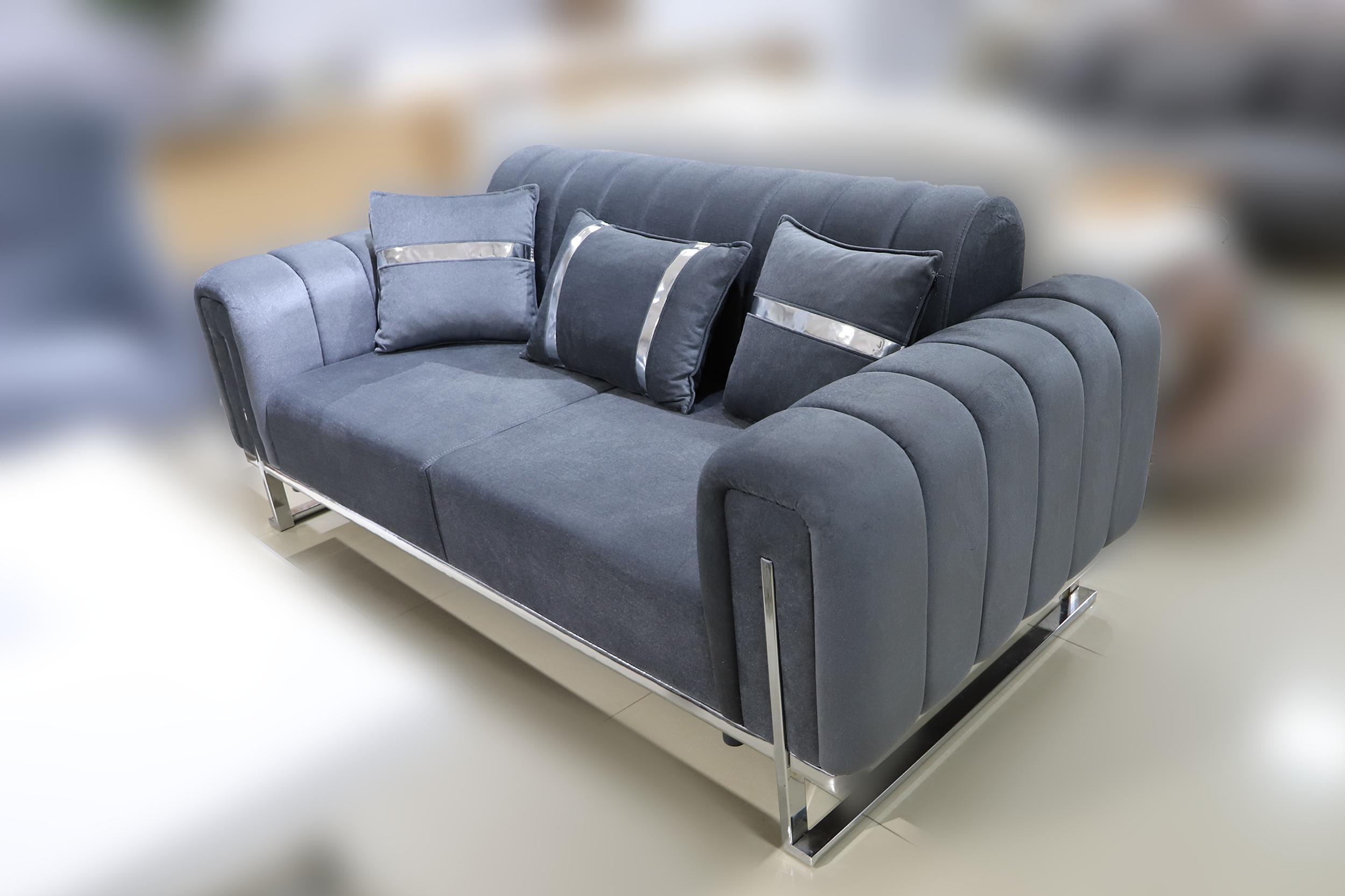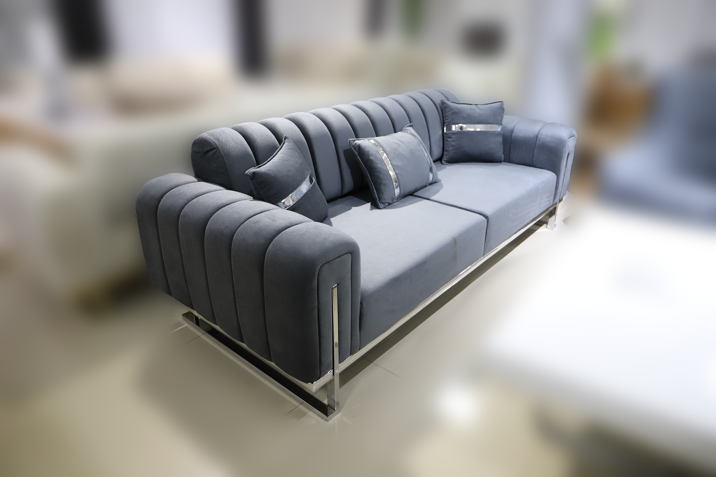 Garnitura Berlin 3-2-1 Sivo–Srebro kombinuje moderan dizajn, neutralne sivo tonove i elegantne srebrne detalje koji unose savremen i luksuzan karakter u prostor.