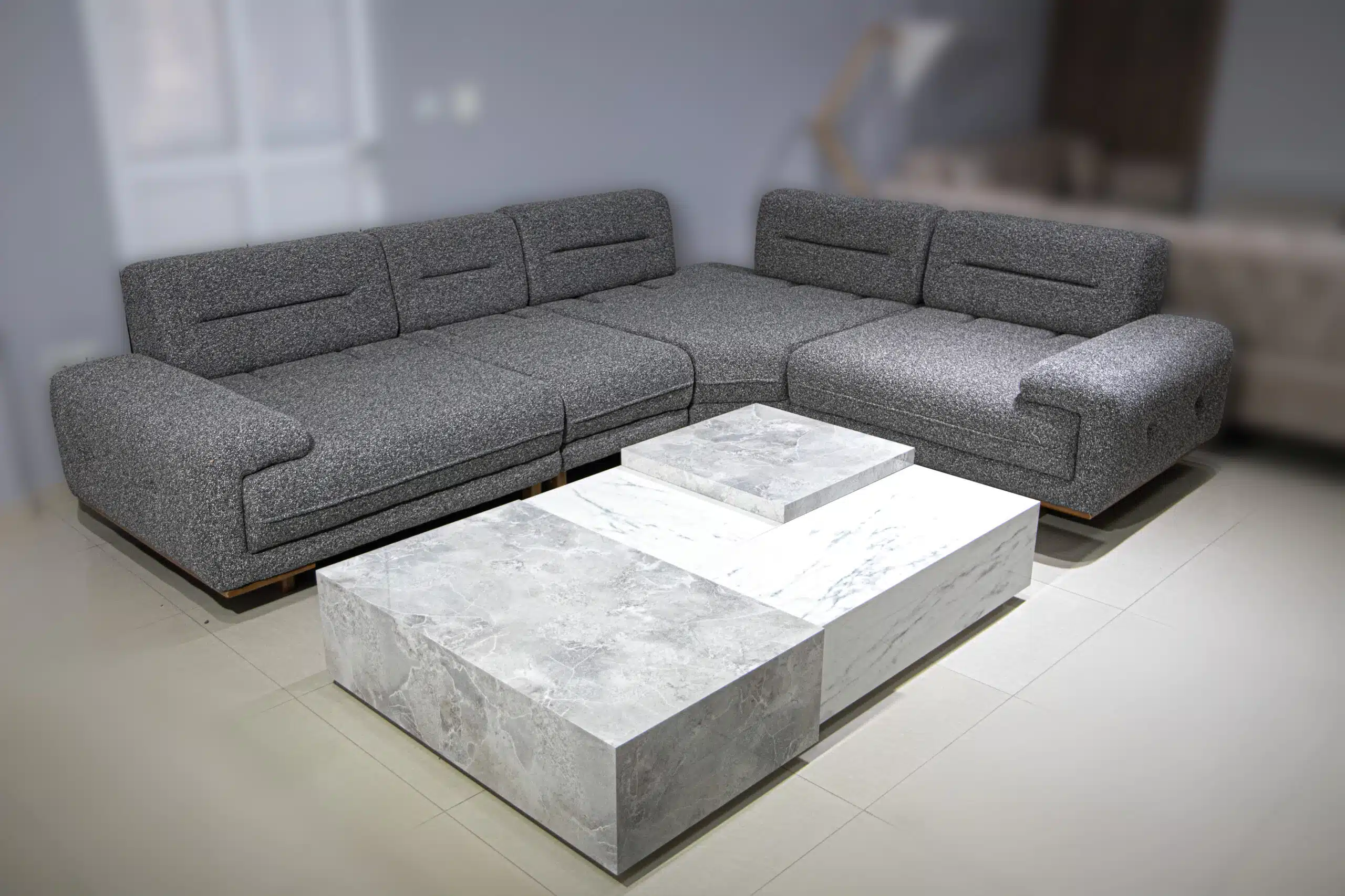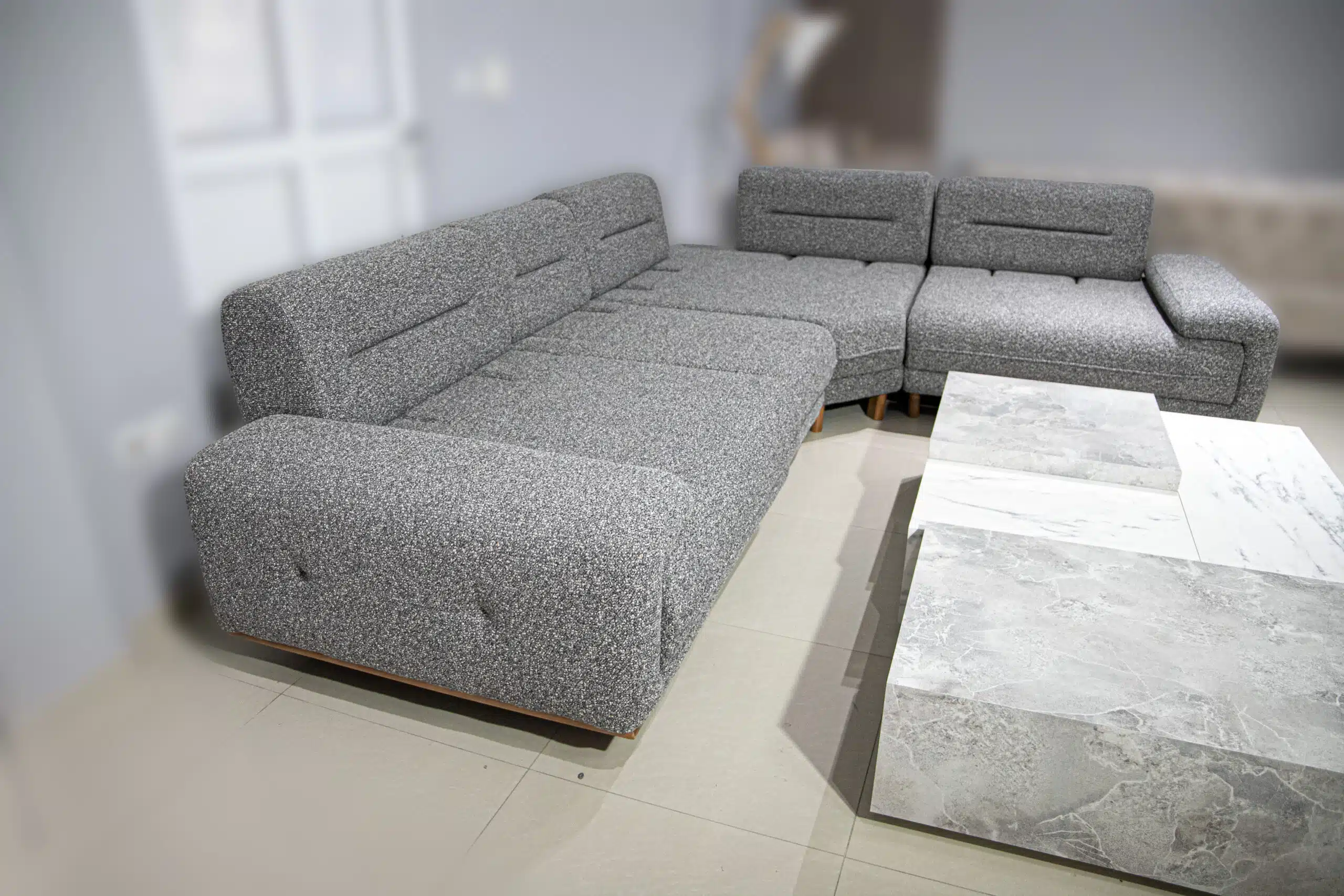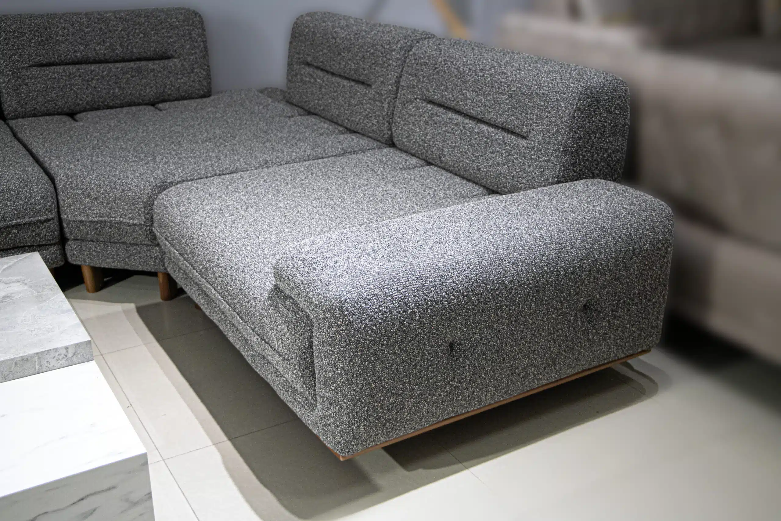Ugaona garnitura Elegance dimenzija 310x250cm, izrađena od kvalitetnog bukle materijala sa udobnim sunđerastim punjenjem i čvrstim drvenim ramom. Ručno rađene drvene nogice pružaju dodatnu eleganciju i stabilnost. Savršen spoj udobnosti i stila za vaš dom!
