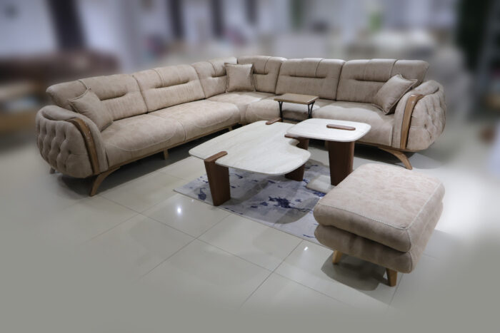 Ugaona garnitura DIOR 300×300 cm u Bež boji predstavlja luksuzno i prostrano rešenje za savremene dnevne boravke. Izrađena od kvalitetnog štofa, sa udobnim sedenjem i tabureom u kompletu, pruža maksimalan komfor i elegantan izgled.